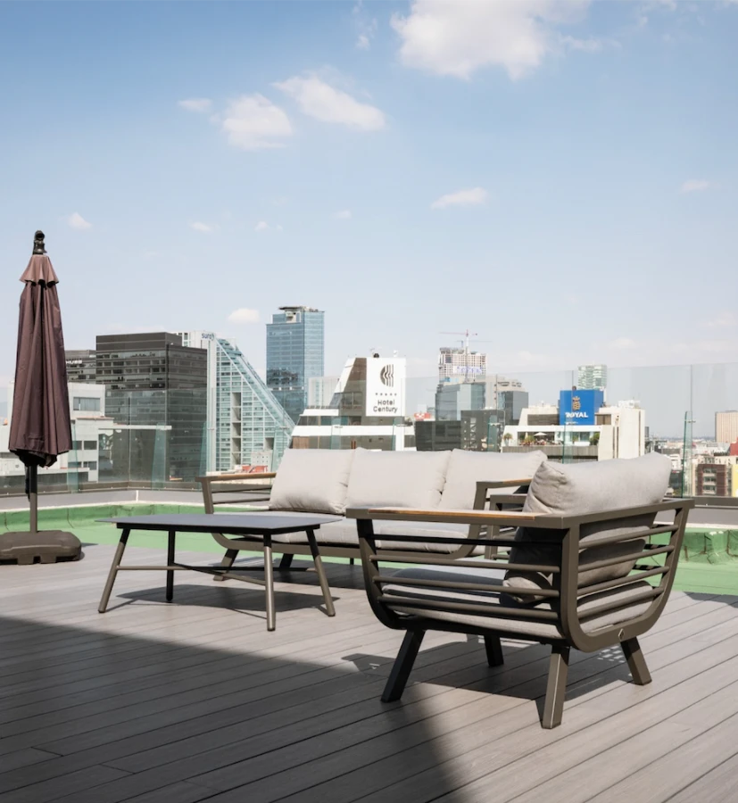 Howdy's office in Mexico City (commonly called "CDMX" — short for Ciudad de México) is located in Roma Norte. One of the capital’s most sought-after neighborhoods, the area is surrounded by parks, cafes, and creative vibes. Inside, the Howdy House is set up for focused work and collaboration, with workstations, private booths, meeting rooms, and communal areas. A standout feature is the rooftop deck, with sweeping skyline views across the city.